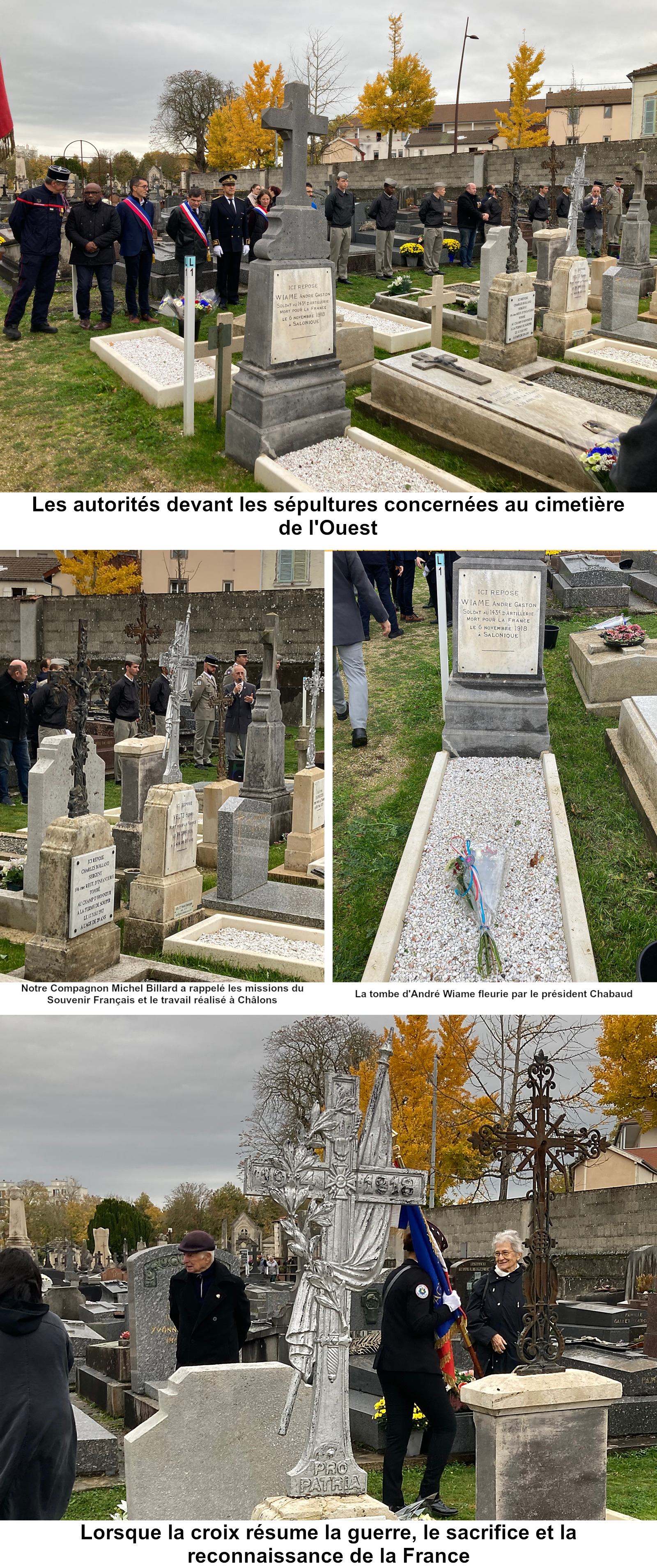 Le samedi 1er novembre 2025, une cérémonie a eu lieu au cimetière de l'Ouest à Châlons-en-Champagne où le Souvenir Français a restauré et préservé vingt-huit sépultures de soldats morts pour la France. Si certains combattants de la Première Guerre mondiale ont été portés disparus, si des soldats ont bien été identifiés et reposent dans les nécropoles nationales, si d'autres ne l'ont pas été et ont été ensevelis avec la mention "inconnu", si des morceaux de dépouilles ont rejoint les ossuaires, des familles ont souhaité le transfert dans un caveau familial ou dans une tombe nouvelle au plus près de chez eux d'un père, d'un frère d'un fils tombé au champ d'honneur.