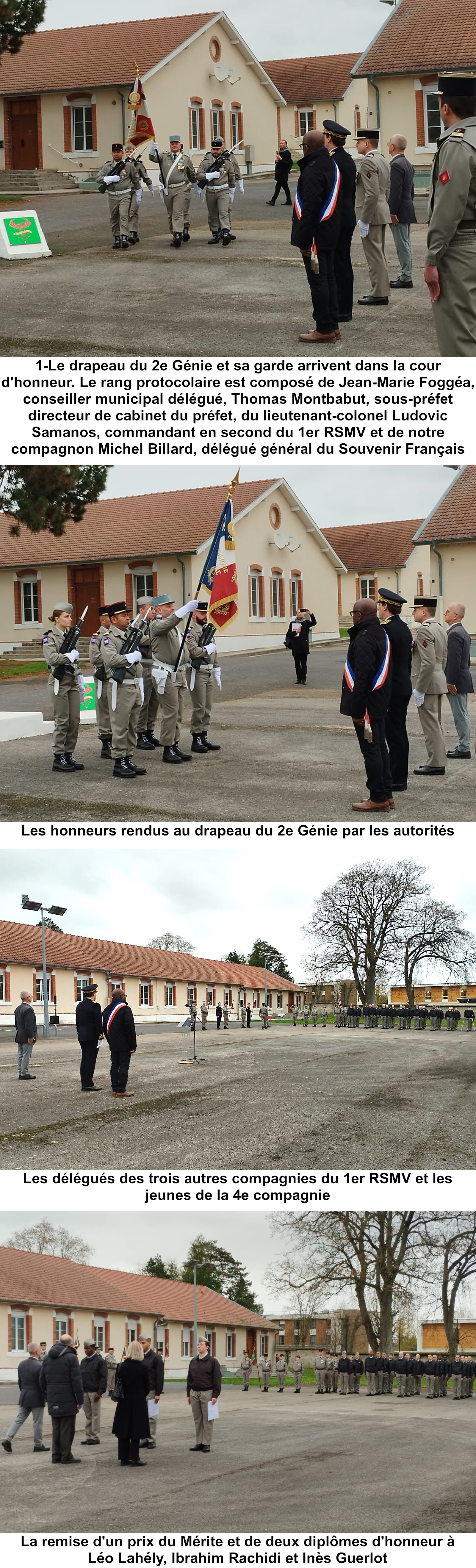 Le jeudi 27 novembre 2025 en début d'après-midi s'est déroulée une cérémonie de remise de calot et de présentation au drapeau du 2e Régiment du génie, des nouveaux arrivés au sein de la 4e compagnie du 1er Régiment de service militaire volontaire (1erRSMV) au quartier Février à Châlons-en-Champagne. Ces jeunes qui ont choisi un encadrement militaire pour acquérir des repères et apprendre la vie en collectivité tout en préparant une qualification professionnelle, en maîtrisant les gestes de premier secours et en passant le permis de conduire se sont retrouvés sur la grande place du quartier et ont vécu leur première grande cérémonie militaire. L'occasion de comprendre qu'il s'inscrivait dans une histoire celle des serviteurs de la Nation dont leurs aînés ont accompli les missions qui leur étaient commandées dans l'honneur de servir et par amour de la Patrie.