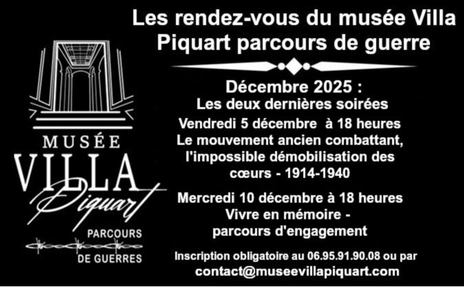 Avant la fermeture annuelle, du 15 décembre 2025 au 1er février 2026, du musée les soirées de la Villa Piquart reviennent pour deux dernières conférences qui seront prononcées par notre ami Antoine Carenjot, historien des conflits contemporains, 1er prix 2025 de l'initiative mémorielle de la section Marne de l'Association nationale des membres de l'ordre national du Mérite (ANMONM)