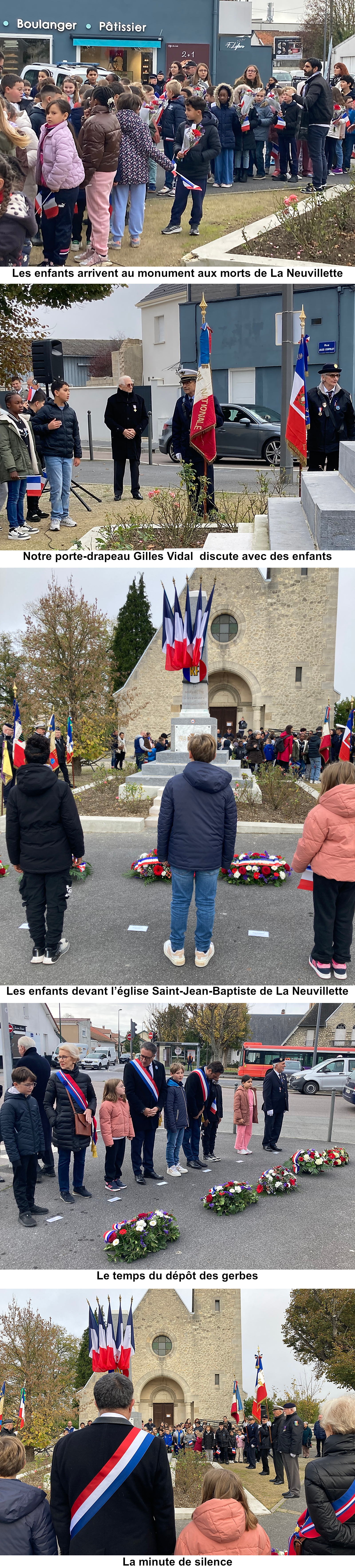 Beaucoup ont découvert à cette occasion ce qu'est une cérémonie patriotique et comment se manifeste la Mémoire de la Nation. Le lundi 10 novembre 2025, à 10 heures, en compagnie des porte-drapeaux, ils se sont rassemblés autour du monument aux morts de La Neuvillette. Ils ont été rejoint par Arnaud Robinet, maire de Reims et président du Grand Reims, Xavier Albertini, député de la Marne, Raphael Blanchard, vice-président du conseil départemental, de nombreux élus, représentants du monde combattant et des ordres nationaux. Le président de l'Union nationale des combattants leur a fait un bref rappel historique sur la Grande Guerre et la signification du 11-Novembre : la signature de l'armistice dans la clairière de Rethondes, la Victoire, le retour de la paix, un bien qui n'est jamais acquis définitivement et qui mérite de s'engager pour le préserver. Les enfants avaient été préparés à cette cérémonie par leurs enseignants. Les écoliers ont déposé des gerbes avec leurs aînés avant de rejoindre en cortège le cimetière.